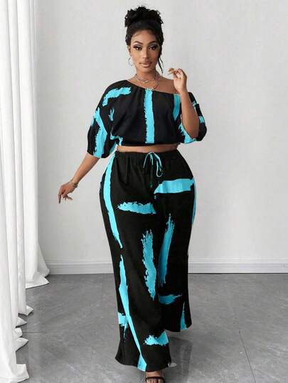 Bold two‑piece set featuring a cropped top and wide‑leg pants with an abstract brush‑stroke print.